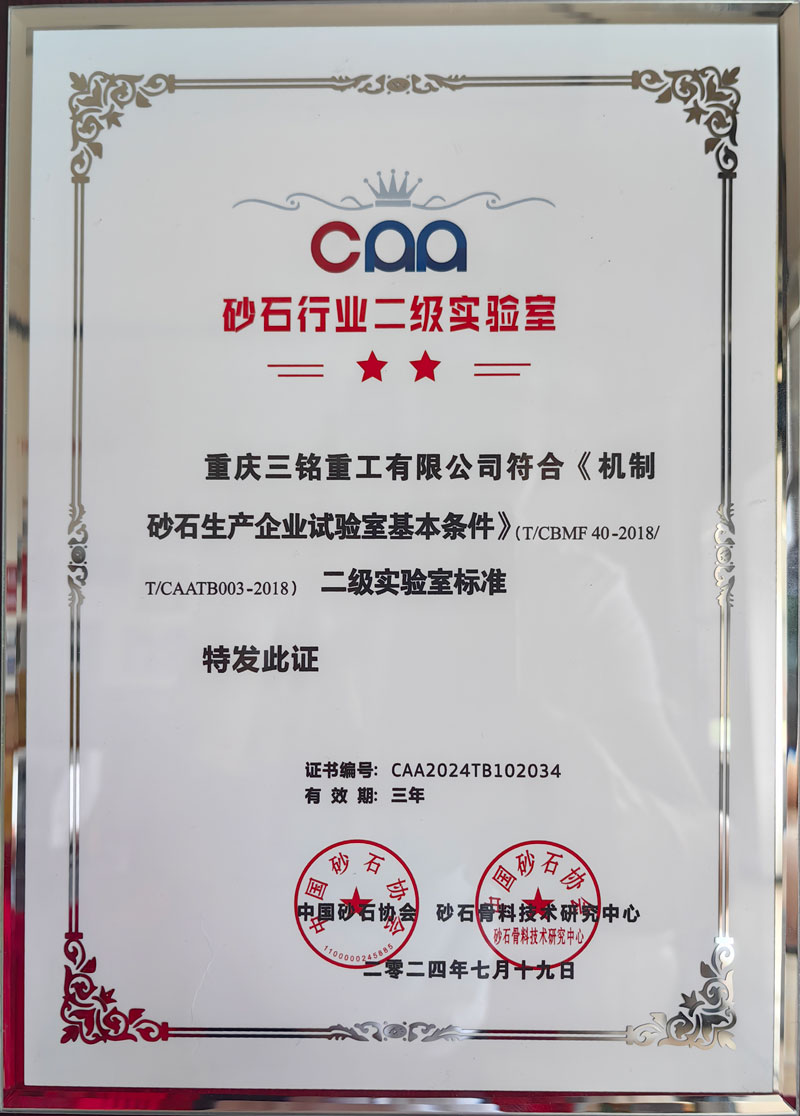 2024年7 月31 日,第十一屆全國砂石骨料行業(yè)科技大會在浙江湖州圓滿落幕。在本次大會上,重慶三銘重工成功榮獲機(jī)制砂石生產(chǎn)企業(yè)二級實(shí)驗(yàn)室的殊榮。