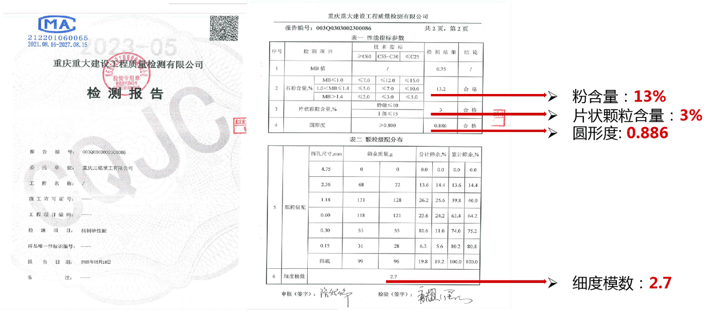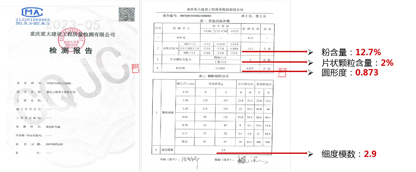 三方機(jī)構(gòu)檢測報(bào)告1:符合國標(biāo)《GB-T14684-2022 建設(shè)用砂》中砂Ⅱ區(qū)標(biāo)準(zhǔn)